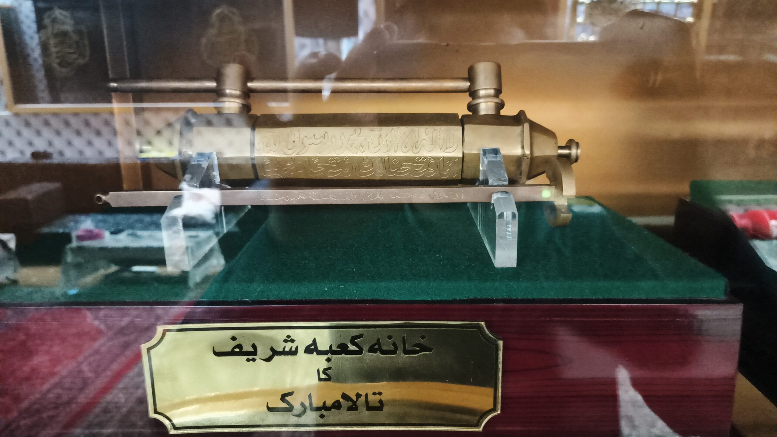 The lock in this display is intricately designed with Arabic calligraphy, bearing inscriptions that reflect devotion and praise to Allah. Such locks are often crafted by skilled artisans dedicated to maintaining the sanctity of the Kaaba. This specific piece was crafted with the utmost precision, reflecting the spiritual essence it represents.